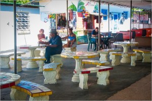 We had lunch at the much recommended Luquillo Kiosks just outside the El Yunque Forests. These kiosks are a row of shops between the Luquillo Beach and the main road, running parallel to the beach. It reminded me off the beach stalls near Chowpatty or Juhu beach in Bombay. All of the shops were open on either side so you could walk in from either the beach front or the main road entrance. Each shop or kiosk has a different type of cuisine ranging from Italian to Thai to Burgers and local PR food. Some of these shops were causal take out places; some were fancy sit down and eat places. In some of them we shared our space with fat tabby cats sunning themselves and in others local lads seemed to be playing an animated game of pool. Juke boxes blared continuously, vehicles tried to find parking and the place was packed with tourists. We liked it so much that we had most of our meals in PR from these kiosks. We had food from La Parrilla (Argentinian food) , Roca Taina (local cuisine), Ely’s Place (local food) and  a few others. We mostly had local food: mofongo (a sort of a plantain veggie mash served with meat of your choice), beef croquettes, arroz con Fanfules (rice and pigeon peas), tostones (flattened raw plantain crisps), seafood of all kinds and a variety of vegetable and meat fritters. What was startling to me was that the ingredients used were very similar to Kerala cuisine (rice, plantain, pigeon peas, ripe bananas, seafood, beef and the addition of coconut in every dish!) but the resulting dishes turned out to be either extremely familiar (beef croquettes or fritters) or completely novel (mofongo and tostones and an amazing pineapple-coconut candy).