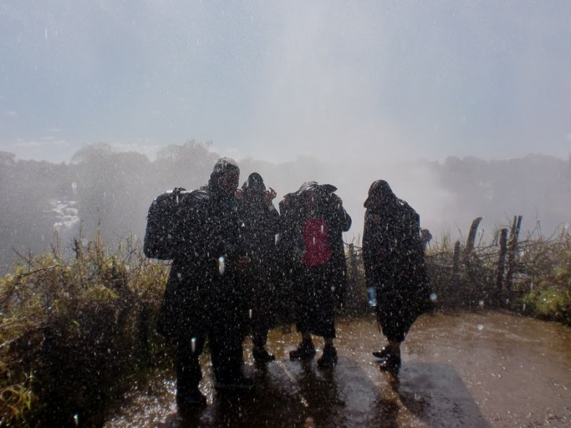 Even from a distance, we could see the mist rising and curling like smoke into the sky. I remembered reading that the locals called the falls “The Smoke That Thunders,” and it felt like a perfectly apt name. Once Stanley parked the car, he handed us a few scruffy-looking raincoats and went to get our tickets for the Victoria Falls State Park. It was a bit tricky trying to maneuver the raincoats over our handbags, which we couldn’t leave in the bus since they held our wallets, passports, and in Seejo’s case, his camera gear. It didn’t take us long to realize the raincoats were useless anyway since the buttons were broken and none of us could fasten them properly. We began our walk through the park from the foot of the Livingstone statue. David Livingstone was the first person from the western world to view the falls in the late 1850s. Recalling the famous explorer Stanley’s first meeting with Livingstone, I couldn’t resist taking a picture of our own guide, Stanley, beside the statue.