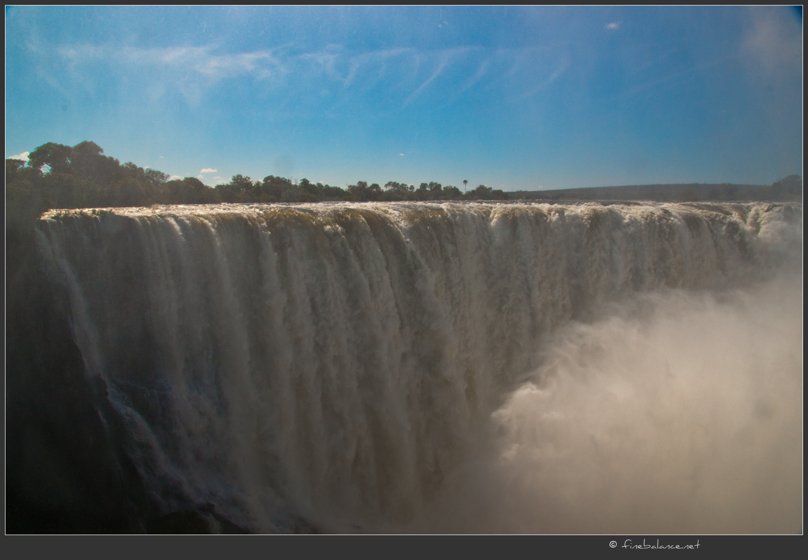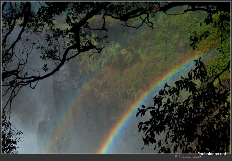 From there, we followed a guided loop. From the Zimbabwe side, four of the five major falls that make up Victoria Falls are visible. The first was the Devil’s Cataract, framed by two beautiful rainbows. To get a closer view, we descended about seventy steps to a point overlooking the cataract. The Zambezi River plunges through a series of narrow, high gorges with steep, almost vertical walls to create this incredible natural wonder. The water spray grew heavier as we moved between viewpoints until it felt like we were standing in a torrential downpour. Our old, hoodless raincoats offered little protection, and we were soon drenched. We could barely make out Livingstone Island between the Main Falls and Horseshoe Falls. When the wind shifted, we’d catch a ghostly glimpse of trees through the mist, but most of the time all we could see was a vast white curtain. By the time we reached the Horseshoe Falls viewpoint, the spray was beating down so hard that it was all we could do to keep our eyes open and our footing steady. Dripping wet but exhilarated, we paused at the bridge connecting Zimbabwe to Zambia. Our guide pointed out that the center of the bridge was a favorite spot for bungee jumpers, though none of us were tempted.