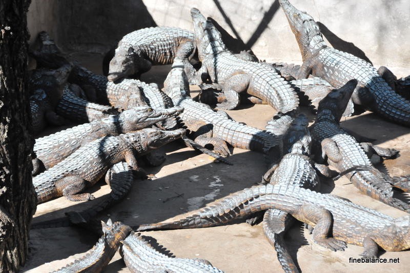 Our last stop in Zimbabwe was a crocodile farm. It was immediately clear that this was no wildlife sanctuary but a true farm, where crocodiles were raised for their skins. A young guide named Marvelous (people here had remarkable names; our waiter at Ilala was called “Gift”) showed us around. Large pools held dozens of crocodiles, sometimes piled atop one another. Each pool housed a different age group, with yearlings being the most valuable for their fine skins. Some pools even had chemically treated water to tint the skins red or indigo for specific leather colors.