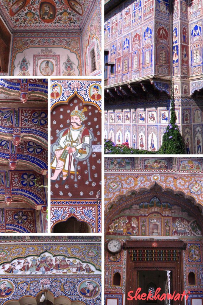 Shekhawati, with its painted havelis (mansions), was the undisputed highlight of the trip for me. Once owned by wealthy traders, these homes are entirely covered in intricate paintings: walls, ceilings, floors, columns, every available surface pressed into service. The colors are natural, the themes wide-ranging: mythological scenes, nature, Mughal and Hindu figures. The descendants of those art loving traders who live in these havelis now cannot afford the upkeep and so the designs have faded away and there is an atmosphere of shabbiness that is very prevalent. But amongst the entire general derelict, there are a couple of houses that showcase the original grandeur of these painted havelis.