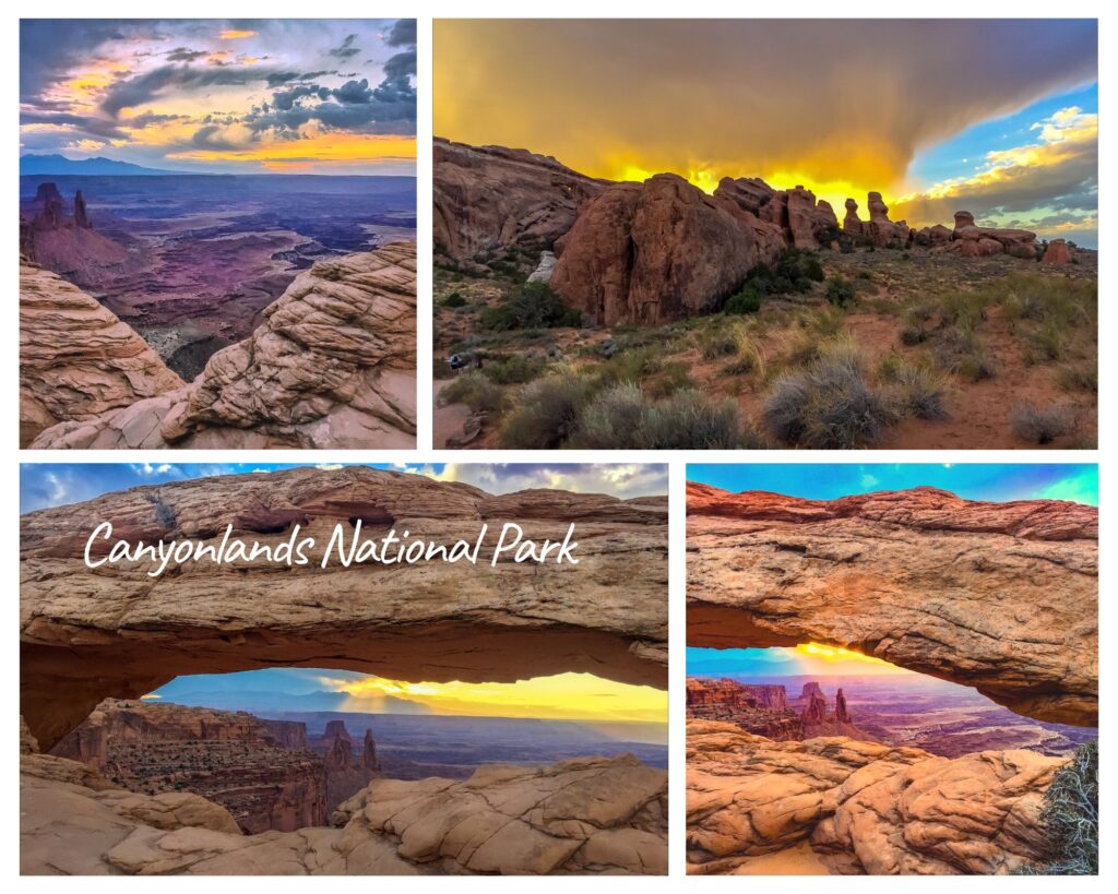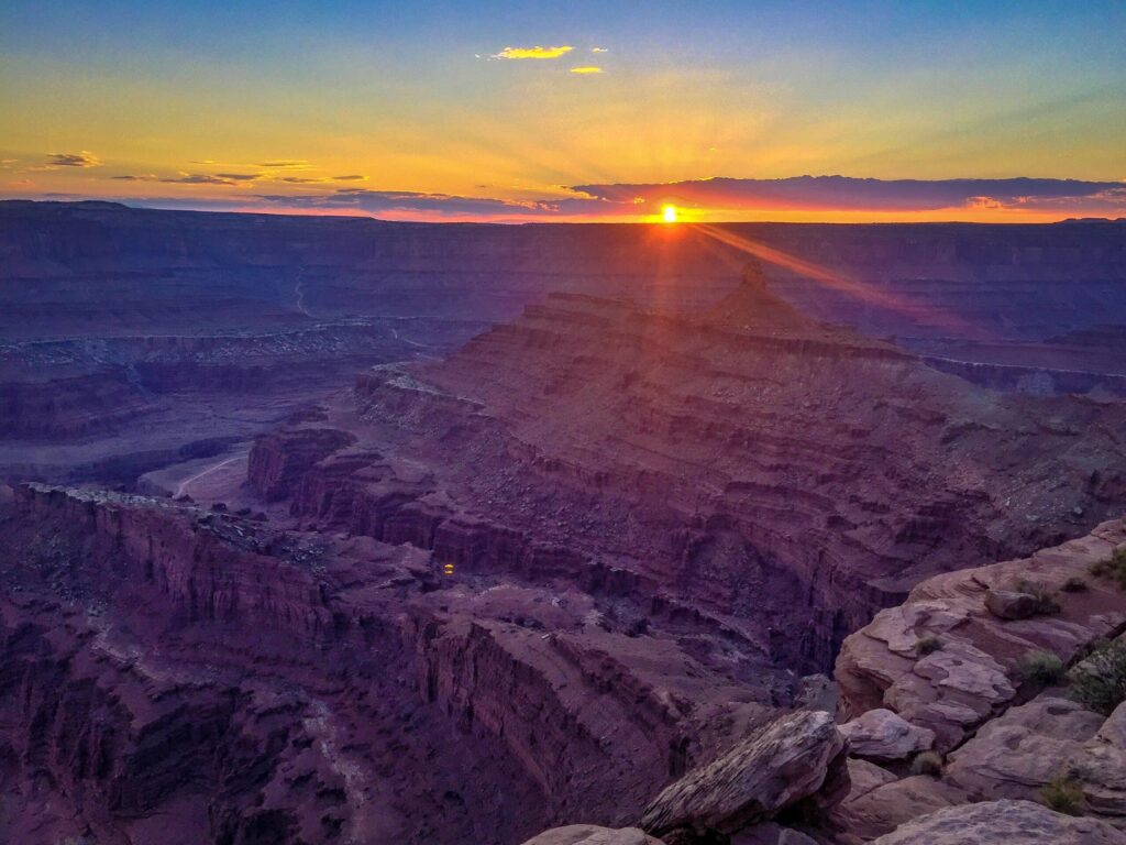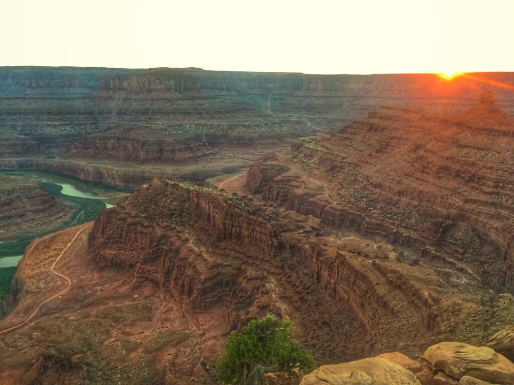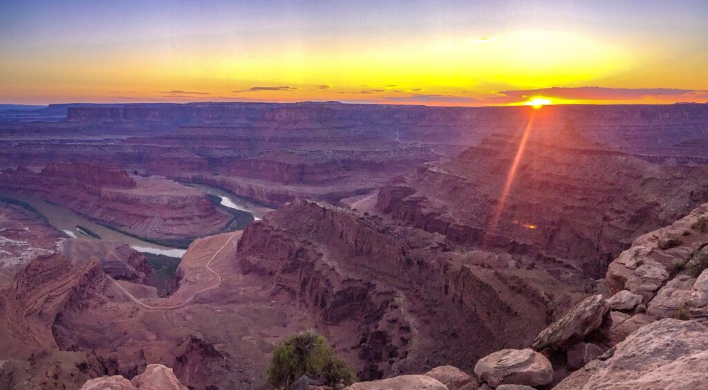 We reached Dead Horse Point State Park around sunset. A massive rock formation near the entrance made our car look tiny. Across the road was Moab Giants Dinosaur Park, which looked interesting but was already closed. The overlook at Dead Horse offers sweeping views into Canyonlands National Park, where red cliffs frame a valley carved by the Colorado River. The gooseneck bend of the river is a popular photo spot for good reason. We arrived just in time for sunset and were able to take in the colors as they shifted across the canyon.