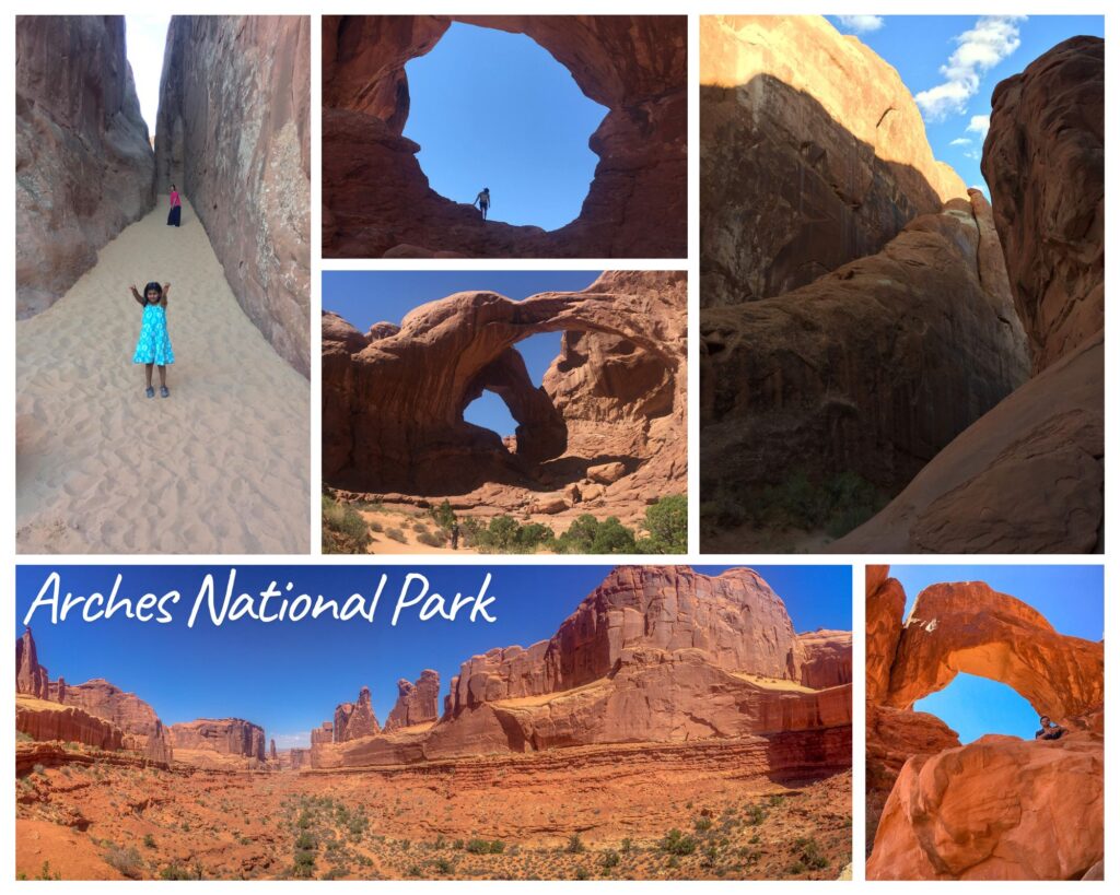 We hiked to several arches, including Double O Arch, Landscape Arch, Skyline Arch, Tunnel Arch, and Pine Tree Arch. Double O Arch spans about 148 feet and rises roughly 104 feet. It is a short hike to reach it. The kids had a great time scrambling up and sliding down. Many of the arches require short hikes, some under a mile and others more strenuous. We planned to stick to the easy trails but ended up walking close to five miles over the course of the day. The kids, including my 3-year-old son, handled it without complaints. This is when the travel became worth it. Pine Tree Arch was my favorite. The trail to it is covered in fine sand, and the kids immediately lay down to make sand angels. Standing beneath the arch, we felt surrounded by sweeping curves of rock that seemed to wrap around us. The most famous formation in the park is Delicate Arch. We did not hike all the way up to it since the kids had already walked several miles. T (my son) asked to be carried a few times and was quick to check whether my arms hurt. If I said yes, he would insist on walking again.
