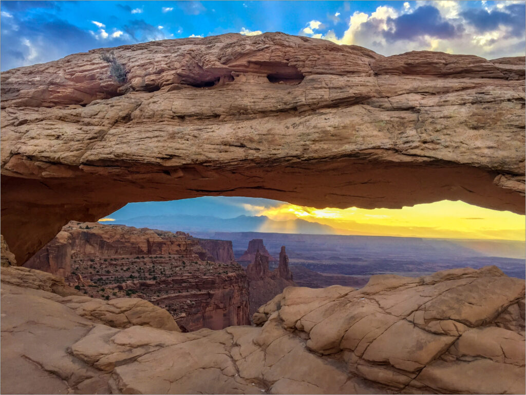 The next morning, S wanted to catch sunrise at Canyonlands National Park, so we left at 6 a.m. for the 50-minute drive. We were not the only ones with that idea. After a short hike to Mesa Arch, we joined a small crowd waiting for the light. Despite the early start, the kids kept up, with a stroller assist for T when needed. Watching the first rays of sunlight illuminate the dark valley was worth the effort. The rock formations shifted from shadow to color within minutes.