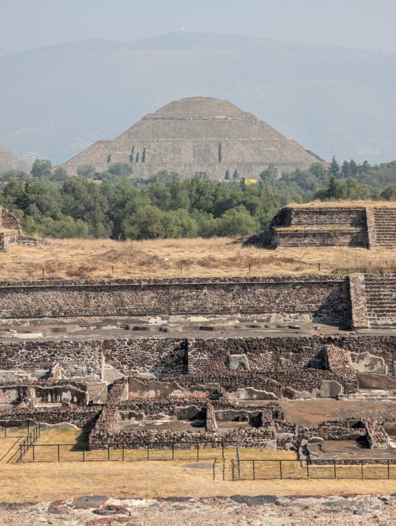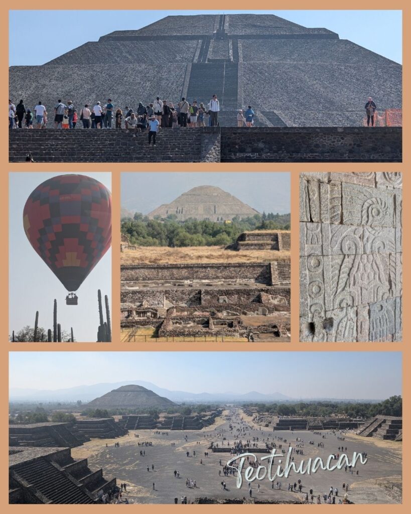Our day started early when our guide Alejandro (Our day started early when our guide Alejandro (Estigo Tours, highly recommended) picked us up at the hotel with our driver, Luis, and we drove about an hour and a half to Teotihuacan. This is hot air balloon country, and as we arrived, the last of the balloons were descending. A dozen or so still dotted the sky, suspended in that soft early-morning light. It was a magnificent welcome. Teotihuacan predates the Aztecs by centuries. In fact, the Aztecs never met its inhabitants. The city had already been abandoned nearly 200 years before they arrived. Yet many of the traditions we associate with later civilizations, pyramid temples dedicated to the Sun, Wind, and Water, rituals of sacrifice ,were already embedded here. It is fascinating to see how civilizations borrow and inherit traditions from the past. I somehow scrambled up the narrow, uneven stone steps of the Pyramid of the Moon, built more than a thousand years ago and slightly crumbling in places. There were moments I was on all fours, questioning my life choices. But the view from the top was worth every wobbly step: a sweeping bird’s-eye view of the Avenue of the Dead stretching out in geometric precision, the Pyramid of the Sun built to mirror the mountain behind it, and grassy mounds that may still be hiding treasures beneath, if only there were funds to excavate more. Alejandro then took us to taste pulque, made from the fermented sap of the cactus, also called agua miel, honey water. It was considered the nectar of the gods. Priests drank it and claimed to hear divine voices. It is slightly trippy to think that parts of human history were guided by men under the influence of fermented cactus juice.