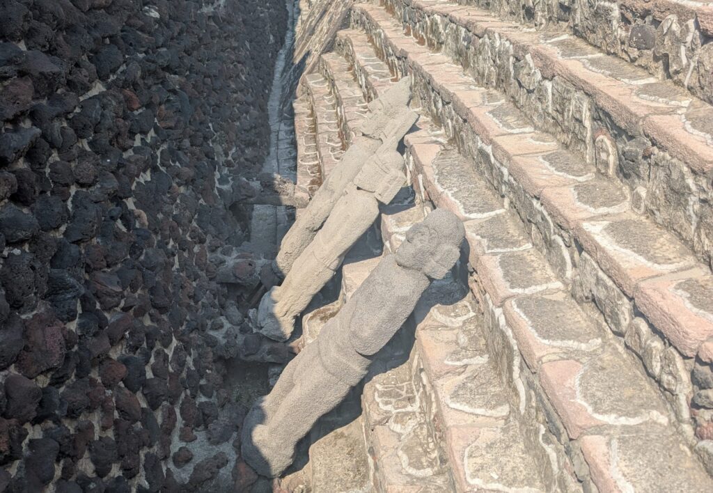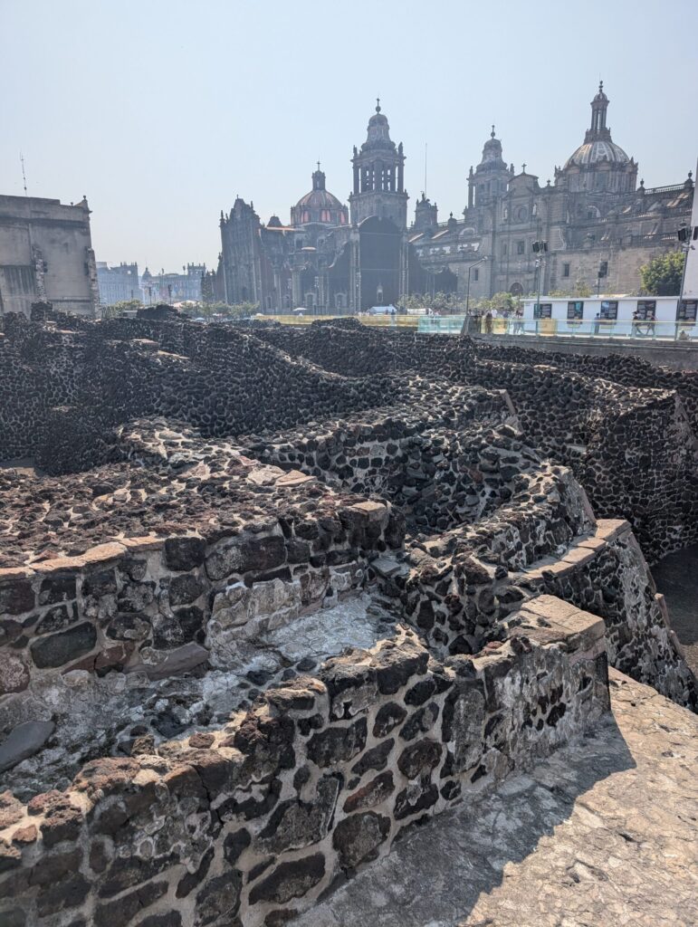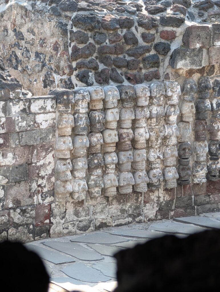 The Zócalo area in Mexico City is the old historic neighborhood. And by old, I mean really old. This was once Tenochtitlan, the beating heart of the Aztec empire in the 1300s. At its peak, nearly 200,000 people lived here. It was a sophisticated, bustling civilization long before the Spanish arrived and Christianity slowly replaced Aztec norms and rituals. Centuries later, construction workers accidentally uncovered an entire buried city in the middle of modern Mexico City. Temples. Marketplaces. Meeting halls. Homes. Sacrificial altars where human sacrifice was the norm. Now tour guides enthrall visitors with stories of how hearts were plucked from living humans and offered routinely to the Sun gods.