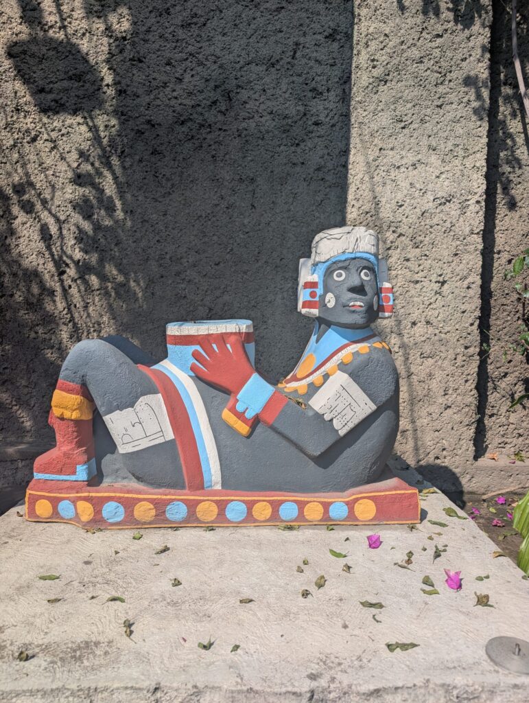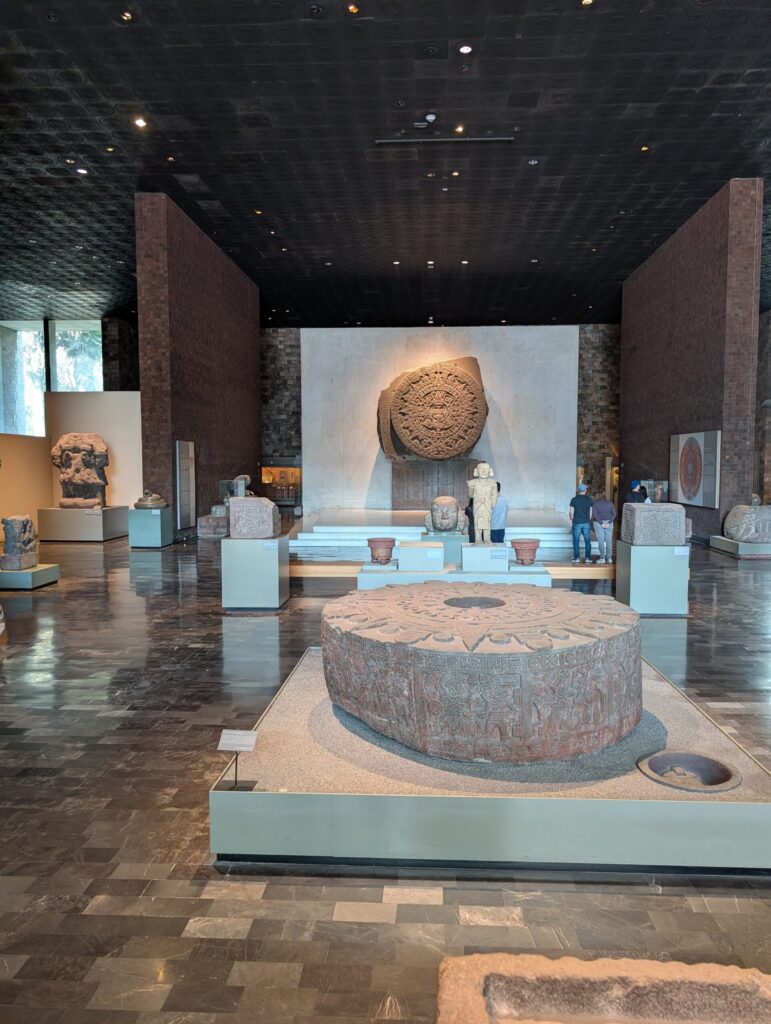 The Chapultepec area near Polanco is a vast green park in the midst of one of the city’s wealthier neighborhoods. The park is expansive and consists of a lake, a castle, botanical gardens, a zoo, and the famed National Museum of Anthropology, all tucked within it. We had another guide here, and I must pause to say that every guide we had in CDMX was excellent: articulate, knowledgeable, and bilingual. The National Museum of Anthropology was a highlight. The construction itself is a wonder. There is a vast central courtyard anchored by a single dramatic pillar that appears to hold up the concrete canopy above, an ingenious piece of architecture that makes the experience even more impressive.