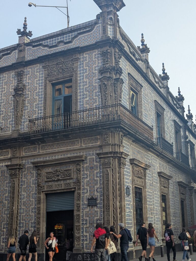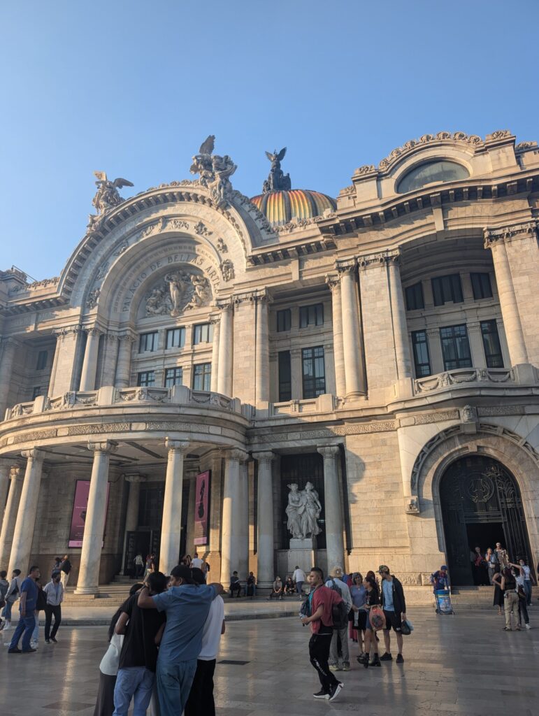 The Zócalo today is the grand public square, enormous and alive. Hawkers line the perimeter. In the center, a massive Mexican flag was rippling quietly. The day we were there, music filled the air and people were setting up makeshift tents and folding chairs for an event that seemed both spontaneous and entirely routine. Bordering the square is the National Palace, home to the Mexican President, and the Metropolitan Cathedral, an imposing Gothic structure commissioned by Hernán Cortés and built over 240 years. The oldest cathedral in the Americas, sitting quite literally on top of an older world. From there we wandered down Avenida Francisco I. Madero, permanently pedestrian-only and blissfully free of cars, with shops on either side, street vendors frying snacks, and toys blinking and squeaking. And then that sound, the unmistakable screech of the rubber “screaming” toy vendors squeeze to get your attention. It’s shrill and sounds like a woman screaming for her life. It may very well be the unofficial soundtrack of CDMX. We made our way to the Torre Latinoamericana and went up to the Skybar. The drink was, without exaggeration, the worst we had in Mexico City. But the view from the top was worth every peso. From above, the Palacio de Bellas Artes rises in white stone with its gold-tipped dome. We stopped briefly to admire the murals inside, wishing we had time for a performance.