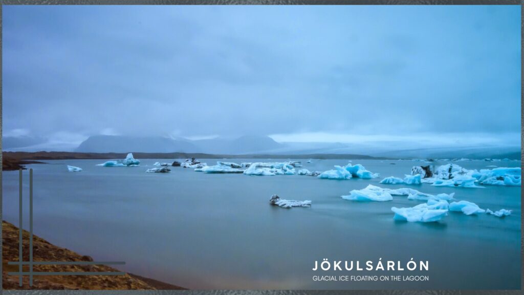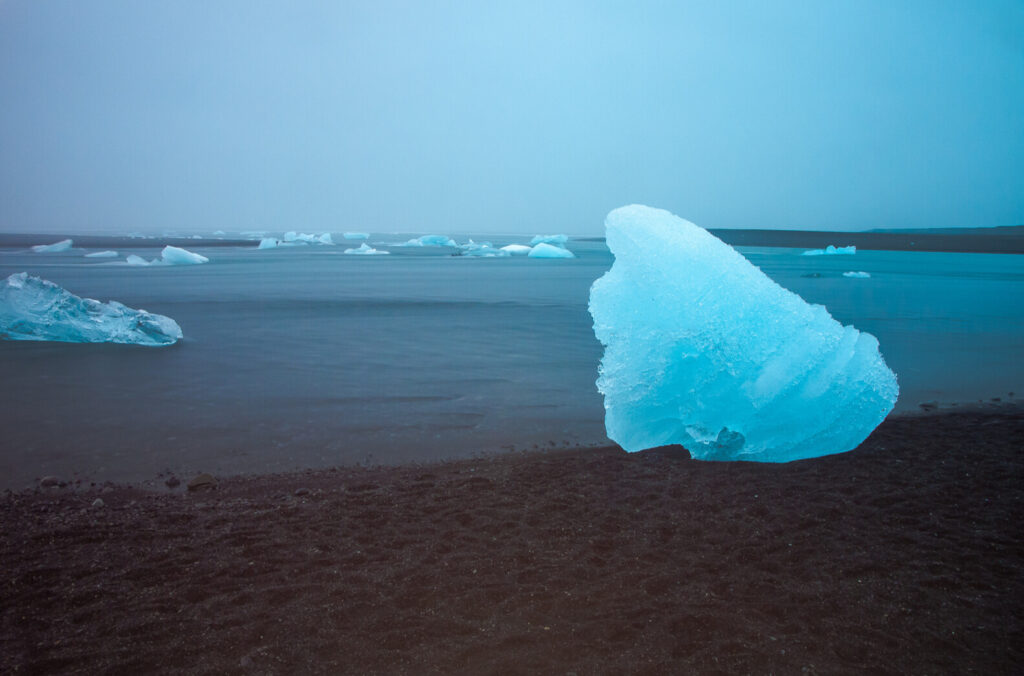 The next morning, after a hearty breakfast of eggs, pancakes with berry syrup, and Iceland’s famous yogurt, Skyr, we set off toward Jökulsárlón Glacier Lagoon in Vatnajökull National Park. Vatnajökull is the largest glacier in Europe and covers about 8 percent of the country. At the lagoon, icebergs break off from the glacier and drift slowly toward the sea. The area has appeared in films such as Die Another Day and Batman Begins. Seeing blue icebergs scattered across the black sand beach was unforgettable. We climbed a small hill to take in the panoramic view of the glacial river filled with floating ice.