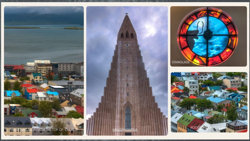 On our final day we returned to Reykjavík, Iceland’s colorful capital. Our first stop was Hallgrímskirkja, one of the tallest churches in Iceland. Its striking architecture was inspired by Iceland’s basalt lava columns. The most intriguing feature to me was the large stained glass style windows in the observation tower. Unlike traditional church windows that depict saints or biblical scenes, these windows portrayed everyday elements of Icelandic life. From the top of the tower we could see a panoramic view of Reykjavík’s colorful rooftops framed by the surrounding sea.